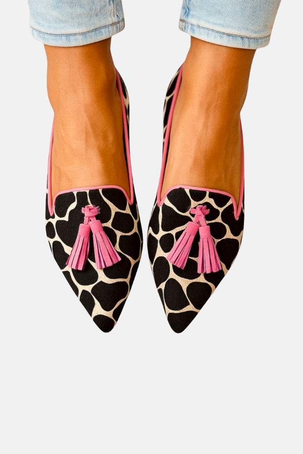 Disse originale og karakterfulde mokkasiner har et slående dyremotiv, der forstærkes af legende kvaster og kontrastfarvede rør. Den tilspidsede tå giver et strejf af elegance, mens den smidige overdel og det dybe design sikrer afslappet, åndbar komfort.